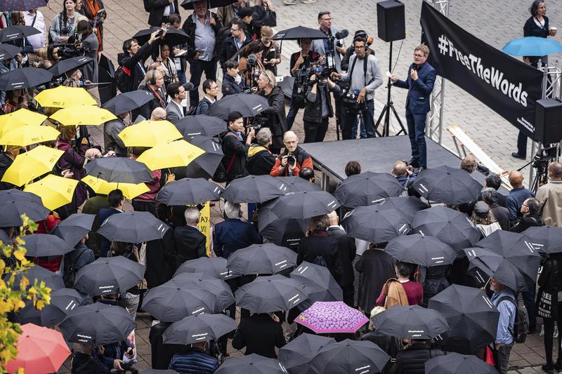 Frankfurt a.M. (epd). Mit Regenschirmen für die Meinungsfreiheit: Menschenrechtler haben sich auf der Frankfurter Buchmesse mit der Protestbewegung in Hongkong und inhaftierten Autoren solidarisiert. "Die Einschränkung der Meinungsfreiheit ist immer das erste Anzeichen eines Unrechtsstaats", sagte der Geschäftsführer des Börsenvereins des Deutschen Buchhandels, Alexander Skipis, am 17. Oktober während einer Mahnwache auf dem Messegelände.