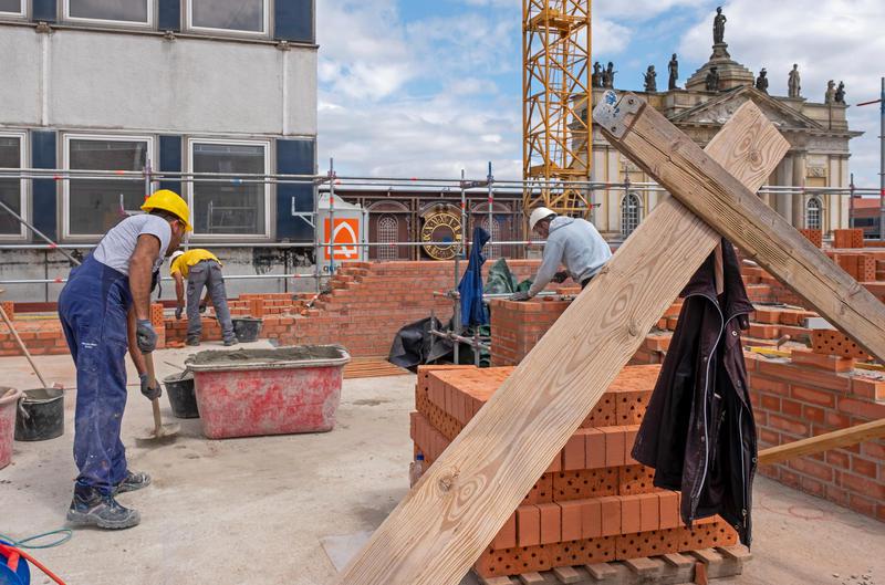 Ein Kran transportiert Mörtelbottiche und Ziegelpakete. Arbeiter montieren am Ort der 1945 zerstörten und 1968 abgerissenen evangelischen Barockkirche Verlängerungen an Gerüste. Maurer setzen Ziegelsteine. Seit Herbst 2017 wird hier gearbeitet, inzwischen steht der Erdgeschoss-Rohbau, drei weitere Etagen im Turmsockel folgen noch. Dann soll mit dem Turmschaft begonnen werden.