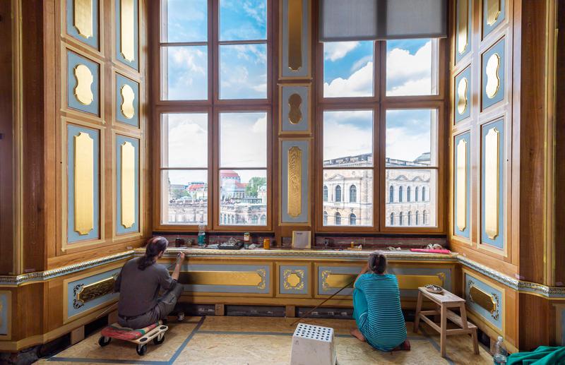 Anhand von Fotos und Originalskizzen konnten zudem zwei etwa einhundert Quadratmeter große Deckengemälde von Louis de Silvestre (1675-1760) neu geschaffen werden. Wie damals seien die Kunstwerke auf Leinwände gemalt und danach an den Decken befestigt und im Anschluss vollendet worden, hieß es. Der gebürtige Franzose de Silvestre wirkte rund 30 Jahre als Hofmaler in Dresden.