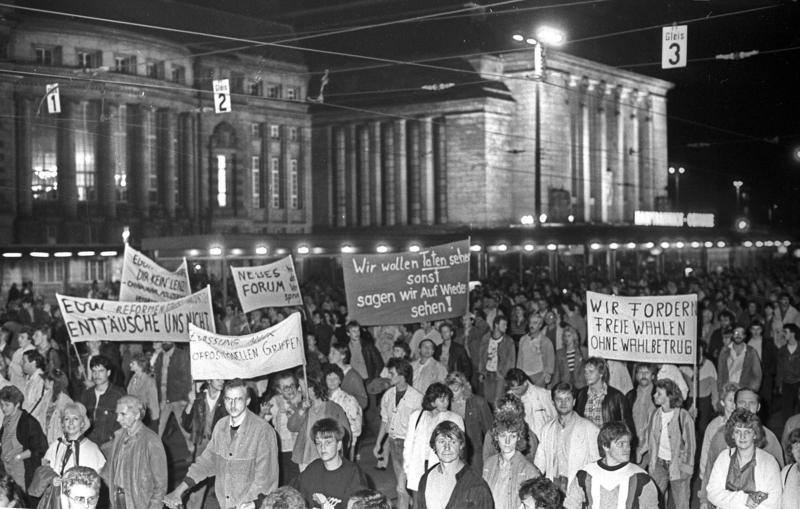 Derweil protestieren vor dem Palast Tausende, es kommt zu Zusammenstößen mit der Polizei. Der sowjetische Staatsführer Michail Gorbatschow, der in der Heimat längst die Wende eingeleitet hat, verlässt das Bankett vorzeitig. In Leipzig werden zugleich Proteste gewaltsam aufgelöst; im vogtländischen Plauen kommt es zur ersten regionalen Massendemonstration mit 15.000 Teilnehmern.