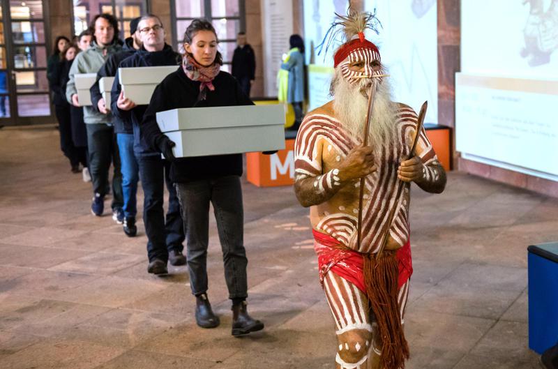 Zuvor hat er Blätter in einer Schale angezündet und gesungen, um die Vorfahren aller Anwesenden einzuladen zu der Zeremonie. Immer wieder schlägt er zwei Bumerangs klappernd gegeneinander. Dann werden die Kisten mit den sterblichen Überresten ins Museumsinnere getragen.