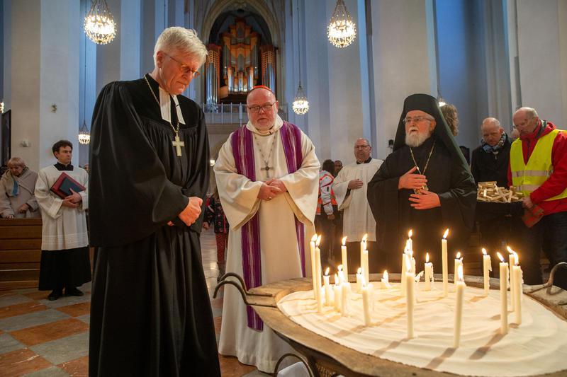 Im Dom bekräftigen der bayerische evangelische Landesbischof Heinrich Bedford-Strohm und der katholische Kardinal Reinhard Marx in einem engen ökumenischen Schulterschluss die Bereitschaft ihrer Kirchen, in ihrem Einsatz für Flüchtlinge nicht nachzulassen. Denn diese Hilfe sei geradezu ein "humanitäre Verpflichtung", sagte Bischof Bedford-Strohm, der auch Ratsvorsitzender der Evangelischen Kirche in Deutschland (EKD) ist. Die Flüchtlinge würden durch Verzweiflung auf die lebensgefährlichen Boote getrieben, weil sie Gewalt und Hunger erlebt hätten, Willkür und Missbrauch ausgesetzt gewesen seien und in ihren Heimatländern keine Perspektive hätten.
