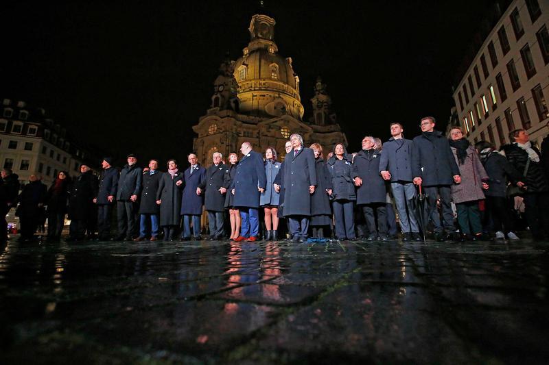 Bei Bombenangriffen der Alliierten zwischen dem 13. und 15. Februar 1945 kamen rund 25.000 Menschen ums Leben. Nahezu die gesamte Innenstadt wurde zerstört. Am Abend umschlossen rund 11.000 Dresdner und ihre Gäste Hand in Hand und unter Glockengeläut die Altstadt mit einer Menschenkette. Seit zehn Jahren wird jeweils am 13. Februar dieses Zeichen des Friedens, der Versöhnung und Toleranz gesetzt. Steinmeier und seine Frau Elke Büdenbender reihten sich vor der Frauenkirche in die Kette ein, ebenso Sachsens Ministerpräsident Michael Kretschmer (CDU).