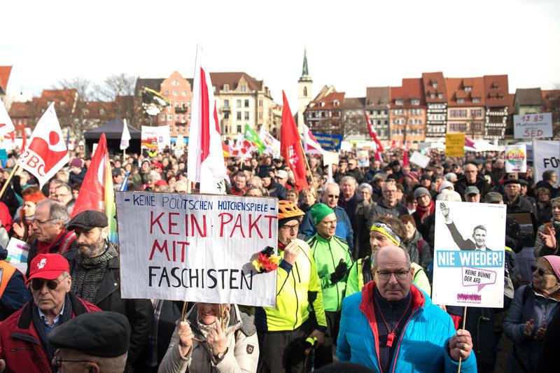 Unter dem Motto "#Nichtmituns: Kein Pakt mit Faschist*innen - niemals und nirgendwo!" hatten der Deutsche Gewerkschaftsbund (DGB) und das zivilgesellschaftliche Bündnis "#unteilbar" zu der Demonstration in der Thüringer Landeshauptstadt aufgerufen. Redner kritisierten das Verhalten von CDU und FDP bei der Wahl und sprachen von einem Tabubruch am 5. Februar. Sie appellierten an die demokratischen Parteien in Thüringen, geschlossen die AfD zu bekämpfen. Die Wahl Kemmerichs zeuge 75 Jahre nach der Befreiung des Vernichtungslagers Auschwitz von unglaublicher Ignoranz und Machtversessenheit, sagte Stefan Körzel vom DGB-Bundesvorstand.