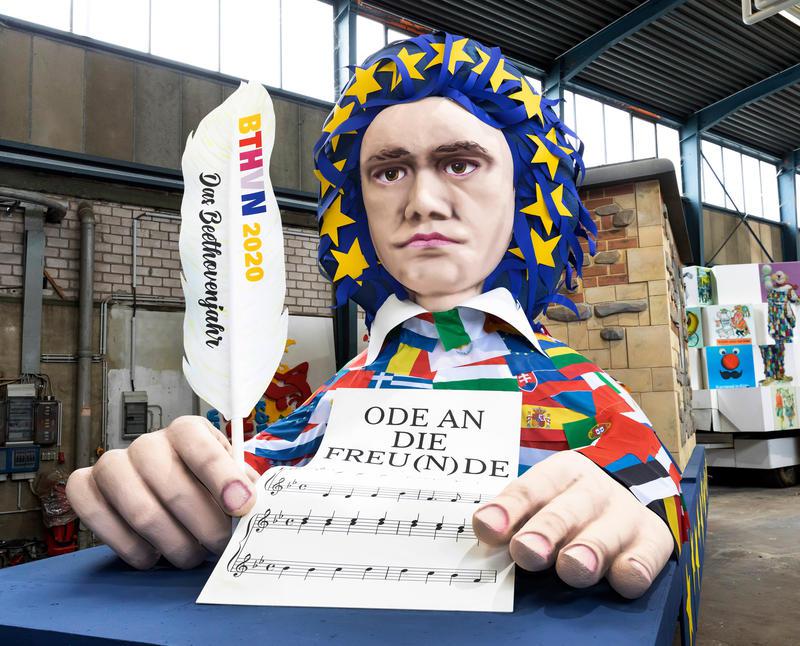 Köln (epd). Bei den Rosenmontagszügen in Köln, Bonn, Düsseldorf und Aachen wird ein Motivwagen mit einer Beethoven-Figur mitfahren, den die Beethoven Jubiläums GmbH und die beteiligten Festkomitees am 14. Februar in Köln vorstellten. Unter dem Motto "Ode an die Freu(n)de" zeigt er Ludwig van Beethoven in einem Lappenclown-Kostüm, das aus den Fahnen der Staaten der Europäischen Union besteht. Über der charakteristischen Haarpracht sind die Sterne der Europafahne zu sehen. Eine Feder, die Beethoven in der Hand hält, zeigt das BHTVN2020-Logo, das als Dachmarke für das Programm im Jubiläumsjahr dient.