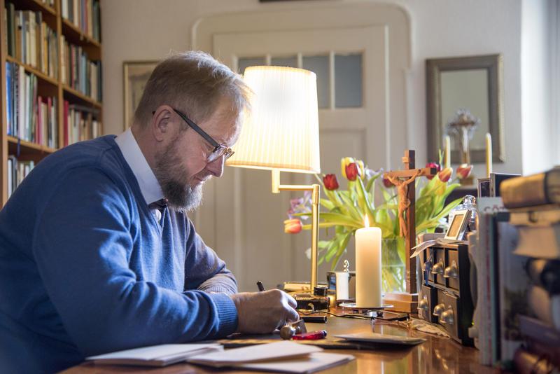 Diakon Hartung greift zur Jugendstilkarte für die Dame, die Kunst so liebt, wie er selbst. "Ich habe beim Schreiben ein Bild von den jeweiligen Adressaten vor dem Auge", sagt er. "Mir fehlen die Leute ja auch." Umso mehr freut ihn: "Ein paar haben schon zurückgeschrieben."