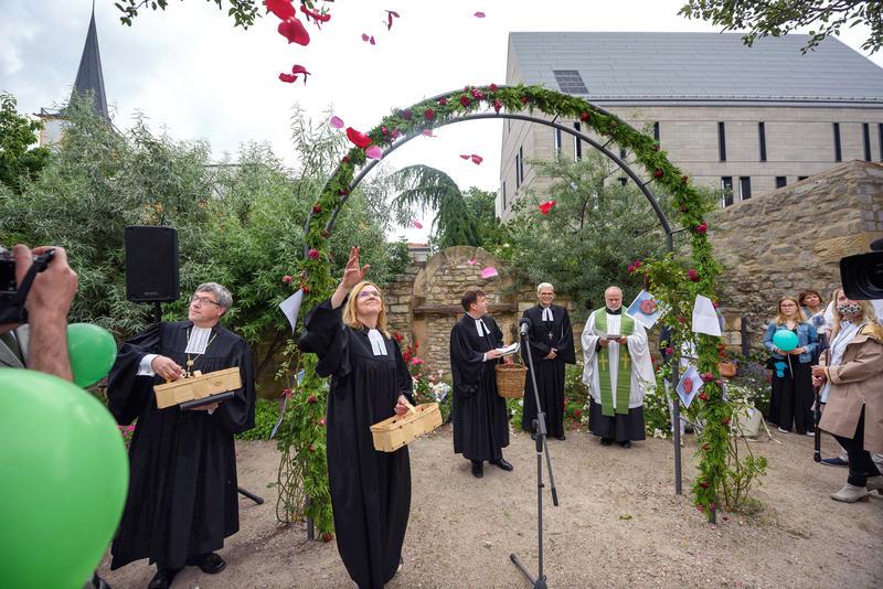 Erfurt (epd). Mit einem Festgottesdienst ist die Rosenkirche im Erfurter Augustinerkloster am 28. Juni ihrer Bestimmung übergeben worden. Die Freiluftkirche ist ein Beitrag der Evangelischen Kirche in Mitteldeutschland (EKM) zur Bundesgartenschau 2021 in der Thüringer Landeshauptstadt. Landesbischof Friedrich Kramer betonte bei dem Festgottesdienst: "Dieser Ort ist der Liebe gewidmet." Er hoffe, dass sich dort Menschen zur Liebe hinwenden und an Gottes Liebe erinnert werden.