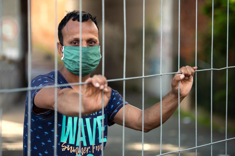 Göttingen (epd). Marius fällt in einem lilafarbenen T-Shirt und einer Trainingshose mit BVB-Logo äußerlich auf. Sein Verhalten aber ist wie in sich gekehrt, während er hinter dem Zaun des Göttinger Hochhauses in der Groner Landstraße 9 einfach wartet. Marius gehört zu den rund 350 Bewohnern, die bis zum 23. Juni zweimal negativ auf das Coronavirus getestet worden sind. Für sie hat die Stadt Göttingen die Quarantäne gelockert. Maximal zu dritt und nur mit Mundschutz dürfen sie nun das Gelände verlassen. Marius geht aber noch nicht raus. "Meine 18 Monate alte Tochter schläft noch", sagt er.