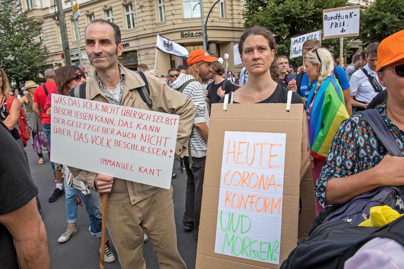Unter die Demonstrationen, zu denen die Stuttgarter Initiative "Querdenken 711" aufgerufen hatte, mischten sich an der Siegessäule und auf der Friedrichstraße offensichtliche Sympathisanten der rechtsextremen Szene. Erkennbar waren sie etwa durch Symbole und Zahlencodes, die auf den Nationalsozialismus anspielen. Der stellvertretende Vorsitzende der Gewerkschaft der Polizei, Jörg Radek, sagte, eine klare Distanzierung der Demo-Teilnehmer von Rechtsextremen habe er nicht wahrnehmen können.