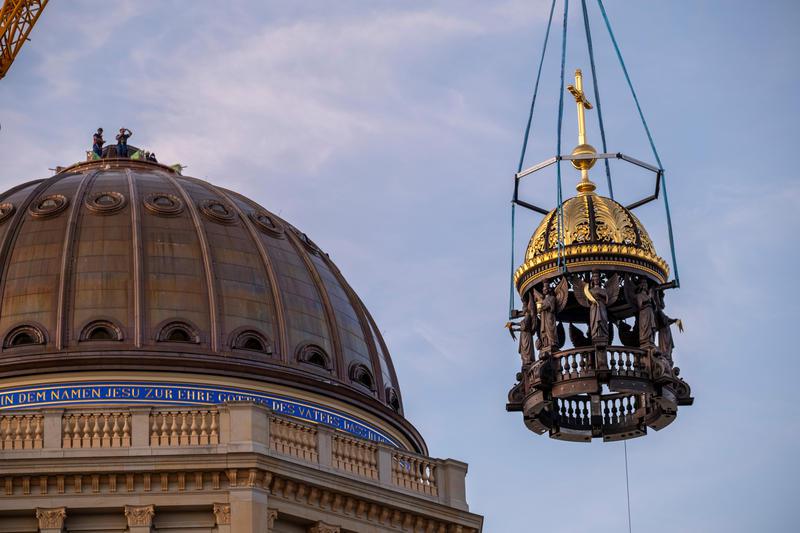 Am späten Abend des 29. Mai war auf das rund 644 Millionen Euro teure Humboldt Forum im wiederaufgebauten Berliner Stadtschloss die 17 Tonnen schwere Kuppellaterne samt Kreuz aufgesetzt worden. Um die Wiedererrichtung des Kuppelkreuzes und die Rekonstruktion eines Spruches aus zwei Bibelzitaten am Fuße der Kuppel gibt es heftige Diskussionen. Der Spruch lautet unter anderem, "dass in dem Namen Jesu sich beugen sollen aller derer Knie, die im Himmel und auf Erden und unter der Erde sind".