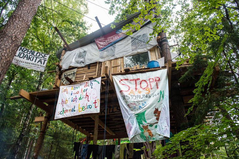 Die Baumhäuser, Hütten und Zelte sind über den ganzen Wald verteilt. An einem Ort hat sich eine Art kleines Dorf gebildet: Ein Baumhaus dient zum Schlafen, eines als Küche, eines als Ruheraum und eines ist die Toilette. Die Häuser sind durch ein Seilsystem verbunden. Pello hat im Hambacher Wald, wo Umweltschützer gegen den Braunkohletagebau kämpfen, das Klettern gelernt. Er lebte dort zwei Monate lang, baute an Baumhäusern mit und machte sie winterfest. "Seitdem bin ich klimapolitisch aktiv." Pello ist sein Aktivisten-Name. "Die Situation fühlt sich gerade stärkend an. Aus Aktivisten-Sicht läuft viel gut. Wir schaffen es, die Räumungen zu verzögern."